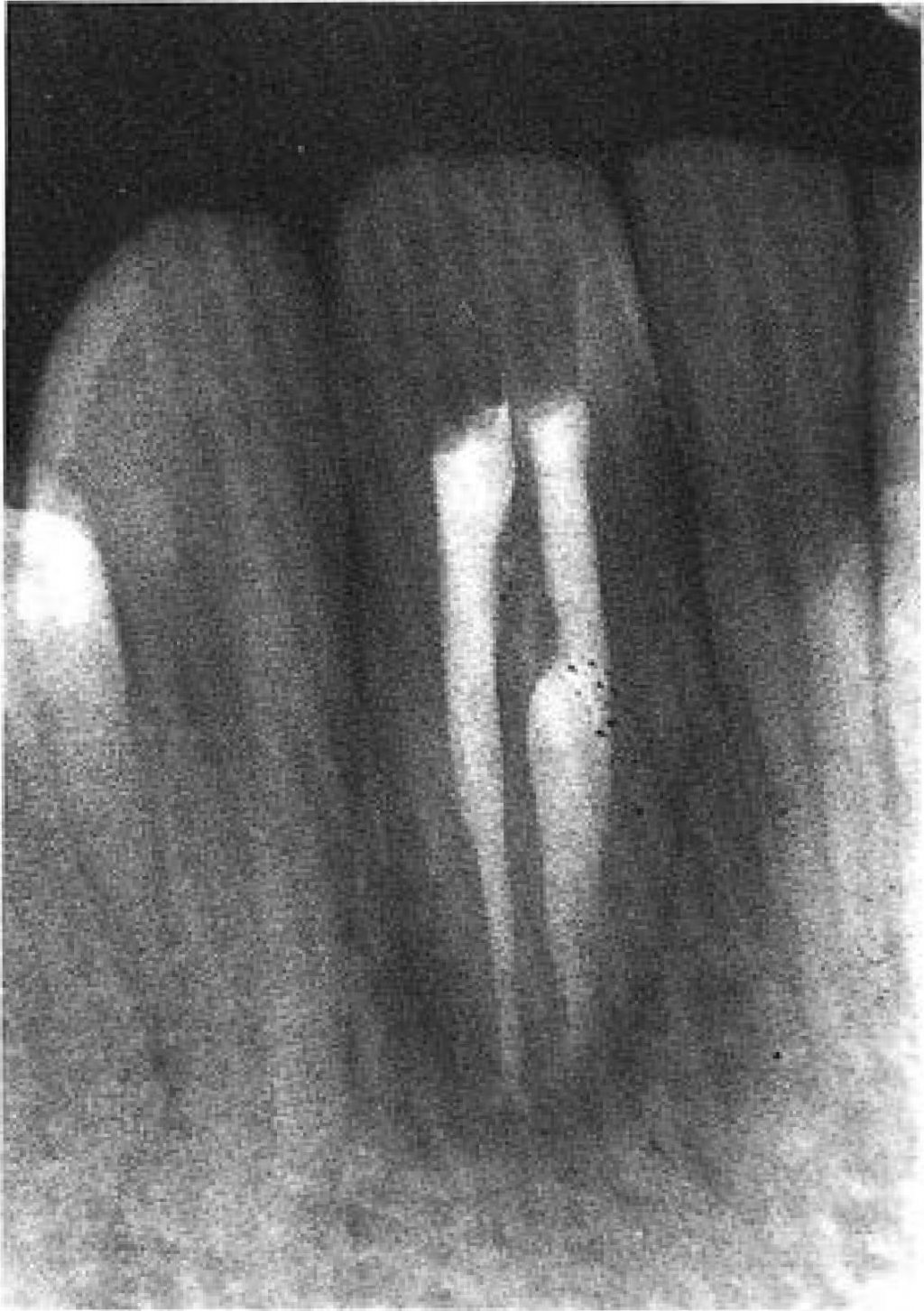 A diagnosis of acute periapical abscess was made and the tooth was opened for drainage. After 4 days, cleaning and shaping of root canals was performed with K files, using the step-back technique and 1-2 ml of 3% sodium hypochlorite irrigant after each file used.At the end of the appointment the root canals were dried and filled with calcium hydroxide paste and the access cavity dressed with a zinc-oxide eugenol cement.
