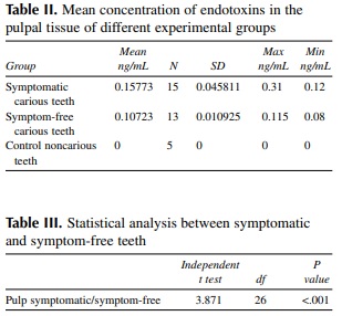 Statistical analysis. To correlate the amount of endotoxins found in the pulp with the presence or absence of pulpal pain, we analyzed the data on the presence or absence of severe and spontaneous pulpal pain and the quantitative determination of endotoxins in the pulpal tissue statistically by means of independent t test.