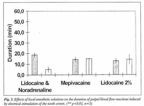 II. Effect of anesthetic solutions on the duration of Pulpal Blood Flow Responses After the monopolar electrical stimulation of the tooth crown in the pretreated animals of the first group the duration of PBF increase was 18.6± 1.9 min. After the injection of Lidocaine 3% plus nor-adrenaline, and the repetition of the same electrical stimulation the observed increase in the PBF was of significant smaller duration than before (5.1 ±2.6 min)(p<0.01, n=5) (Fig. 3).