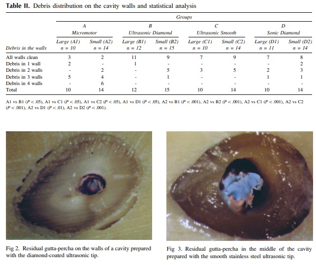 Debris found in the cavities of our specimens consisted of superficial dentinal chips and gutta-percha remnants. Dentin chips were found on the walls of cavities, regardless of the method used, with the highest frequency on the cavity walls prepared with the bur on the micro contra angle slow-speed handpiece in both groups (large and small). This can be attributed to the fact that the bur preparations were made under no water spray, whereas the sonic and ultrasonic tips were supported by irrigation. Gutta-percha remnants were detected on the walls of both large and thin roots in most of the ultrasonically prepared cavities, regardless of the type of tip. Only 1 root in the group prepared with a bur showed gutta-percha remnants and, overall, gutta-percha was most efficiently removed with the use of sonic diamond tips. Thus, in clinical practice the root-end cavity must be cleaned from gutta-percha remnants before placement of the root-end filling. The effects of residual gutta-percha on treatment outcome is unknown and requires further clinical studies. Previous investigations concerning the direction of the root-end cavity prepared with different devices (ultrasonic and rotary) showed that ultrasonic tips produced cavities that are well centered along the axis of the root canal, with less tendency to gauge the canal wall in the thinnest areas of the root, thus reducing the risk of root perforation. These findings were confirmed by the results of the present study.