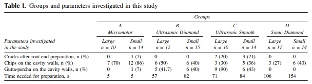 Study design. One hundred extracted single-rooted teeth were endodontically treated, mounted in acrylic resin blocks, and the apical 2 mm of the root-apex was resected. According to the resected root surface area the teeth were divided into 2 groups having large ([2 mm2 ) or small (\2 mm2 ) surface area. For retrograde cavity preparation 4 devices were used: slow-speed handpiece, diamond coated stainless steel ultrasonic tip, smooth stainless steel ultrasonic tips, and sonic diamond-coated tips. Teeth were examined under a videomicroscope for the presence of fractures, dentin chips, and gutta-percha remnants on cavity walls. Preparation time was also recorded.