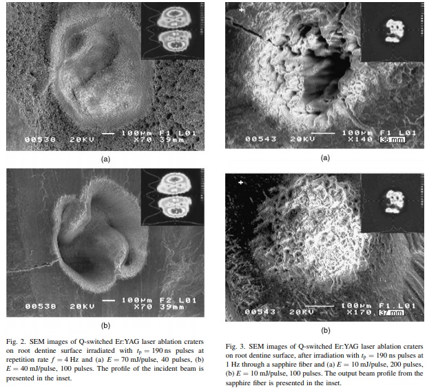 The craters produced, generally, reflect the relevant beam profile. Inhomogeneous spatial beam profiles and short pulse duration result in cracks formation and lower tissue removal efficiency, while longer pulse durations cause hard dentine fusion. Any beam profile modification, due to laser characteristics variations and the specific delivering system properties, is directly reflected in the ablation crater shape and the tissue removal efficiency. Therefore, the laser parameters, as fluence, pulse repetition rate and number of pulses, have to be carefully adjusted in relation to the desirable result.
